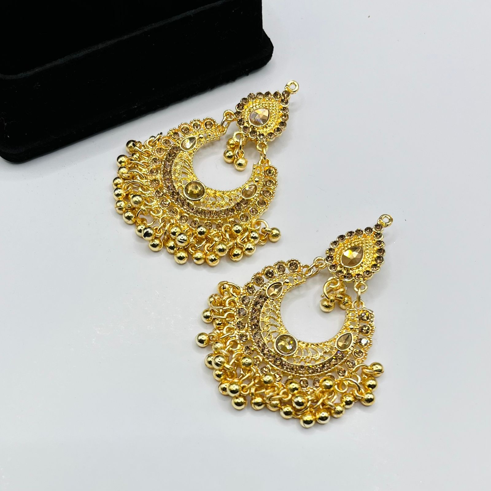 Make a grand statement with these stunning Chandbali Drop Earrings. Inspired by traditional South Asian jewelry, these elaborate earrings are the perfect accessory for weddings, festivals, and special celebrations, adding instant royalty and glamour to any outfit.